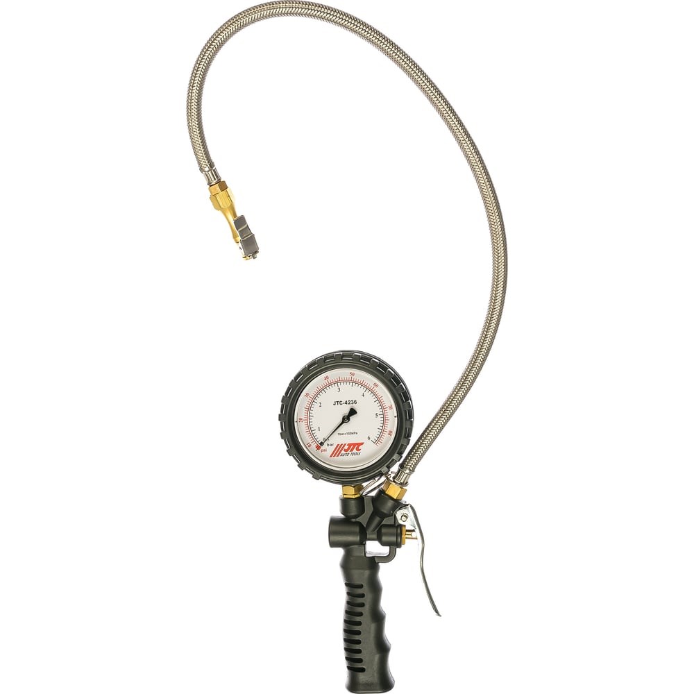 3-х функциональный шинный манометр JTC 4236 предназначен исключительно для профессионального использования. Применяется во время сезонного и индивидуального технического обслуживания самых различных марок автомобилей. С помощью данного прибора можно не только осуществить измерение внутришинного давления, но и отрегулировать его до требуемых параметров. Погрешность измерений при давлении от 30 до 45 psi - + 1 psi, более 45 psi - ± 2 psi.