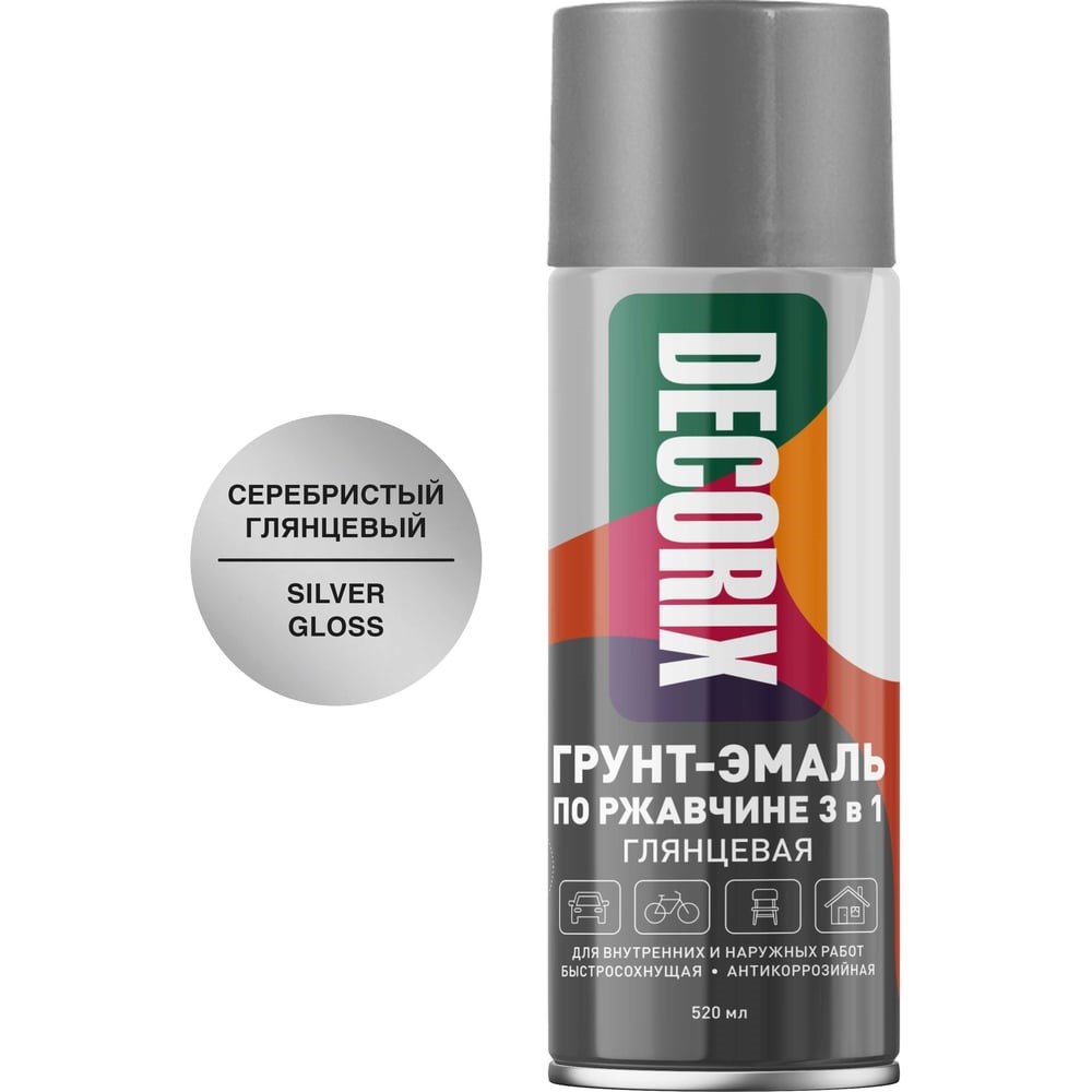 Аэрозольная грунт-эмаль по ржавчине 3 в 1 Decorix (серебристый; глянцевый; 520 мл) 0106-25 DX предназначена для защитно-декоративного окрашивания заржавевших или подверженных коррозии поверхностей из сплавов чёрных металлов при бытовом применении, декоративно-оформительских работах, строительстве и ремонте. Подходит для окрашивания: древесины, пластика, металла, бетона, кирпича, керамики, стекла, картона и минеральных поверхностей. Сочетает в себе свойства нейтрализатора коррозии, грунтовки и защитно-декоративной эмали («3 в 1»), что позволяет сократить время на подготовку поверхности перед окрашиванием. Применяется для ремонтного окрашивания металлических изделий, инструментов и других видов работ. Аэрозольная грунт-эмаль по ржавчине удобна для окрашивания небольших поверхностей и труднодоступных мест. Образует гладкое глянцевое покрытие, устойчивое к выцветанию.