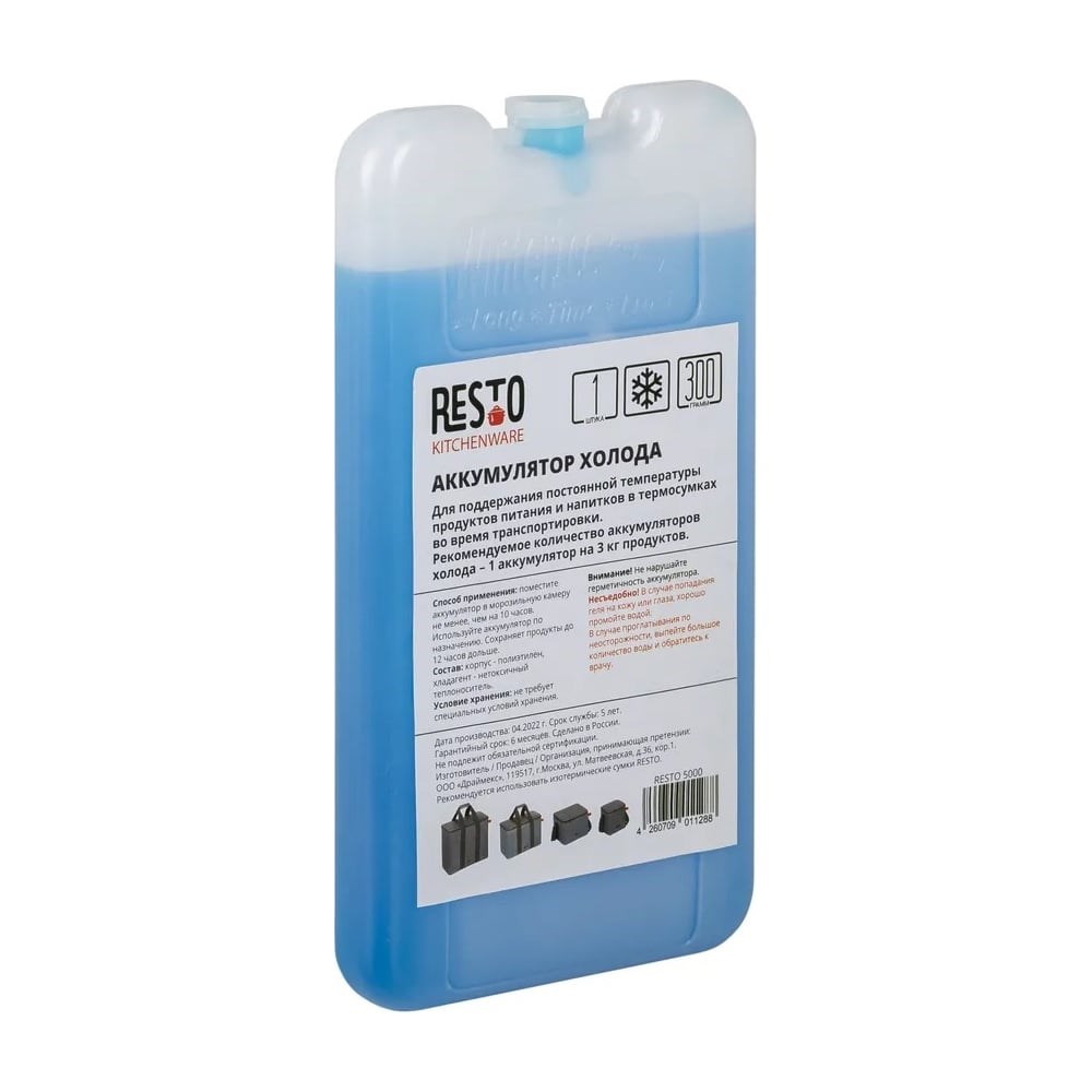 Аккумулятор холода RESTO 5000 используется для поддержания постоянной температуры продуктов питания и напитков в термосумках во время транспортировки. Способ применения: поместите аккумулятор в морозильную камеру не менее, чем на 10 часов. После чего поместите аккумулятор в термосумку вместе с напитками/продуктами. Рекомендуемое количество аккумуляторов холода – 1 аккумулятор на 3 кг продуктов. Состав: корпус - полиэтилен, хладагент - нетоксичный теплоноситель.