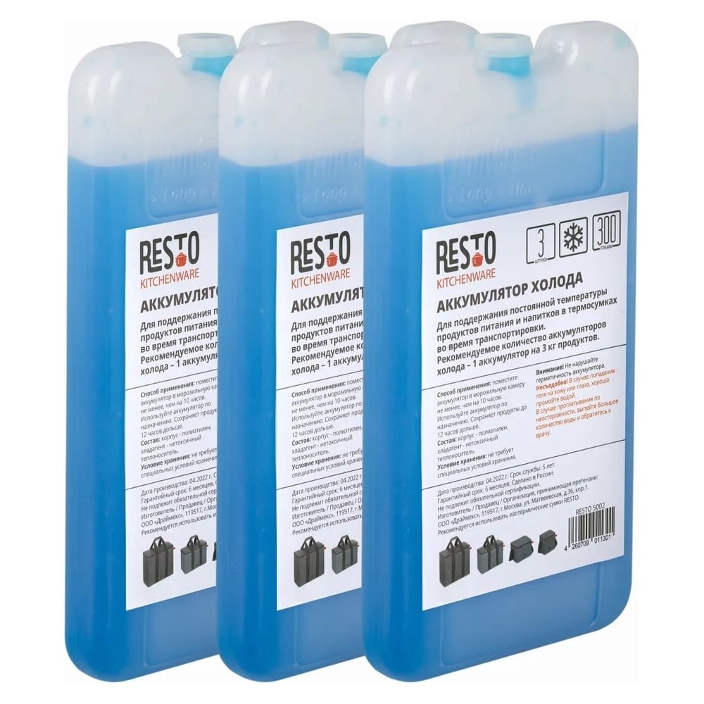 Аккумулятор холода RESTO 5002, 300 г, 3 шт 5002 используется для поддержания постоянной температуры продуктов питания и напитков в термосумках во время транспортировки. Способ применения: поместите аккумулятор в морозильную камеру не менее, чем на 10 часов. После чего поместите аккумулятор в термосумку вместе с напитками/продуктами. Рекомендуемое количество аккумуляторов холода – 1 аккумулятор на 3 кг продуктов. Состав: корпус - полиэтилен, хладагент - нетоксичный теплоноситель. Внешние размеры 1 аккумулятора: 200х110х20 мм.