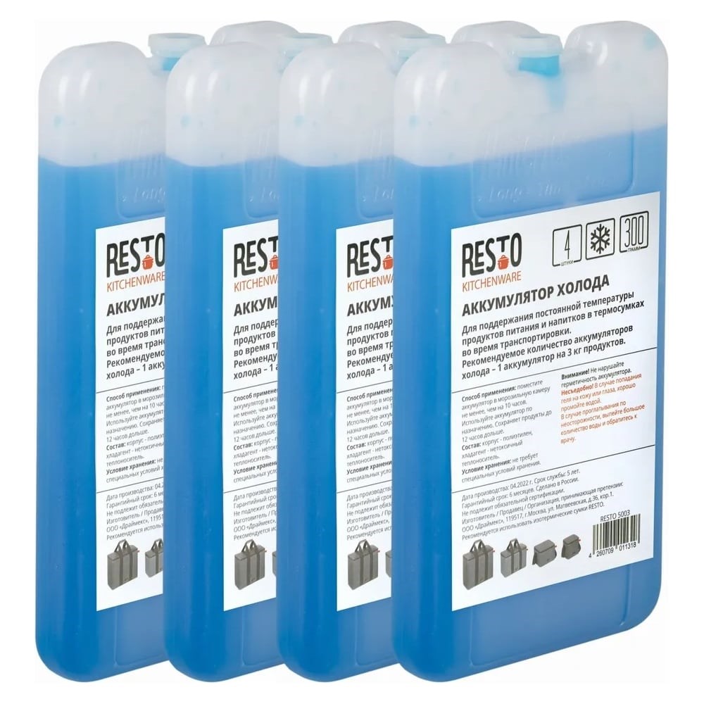 Аккумулятор холода RESTO 5003, 300 г, 4 шт 5003 используется для поддержания постоянной температуры продуктов питания и напитков в термосумках во время транспортировки. Способ применения: поместите аккумулятор в морозильную камеру не менее, чем на 10 часов. После чего поместите аккумулятор в термосумку вместе с напитками/продуктами. Рекомендуемое количество аккумуляторов холода – 1 аккумулятор на 3 кг продуктов. Состав: корпус - полиэтилен, хладагент - нетоксичный теплоноситель. Внешние размеры 1 аккумулятора: 200х110х20 мм.