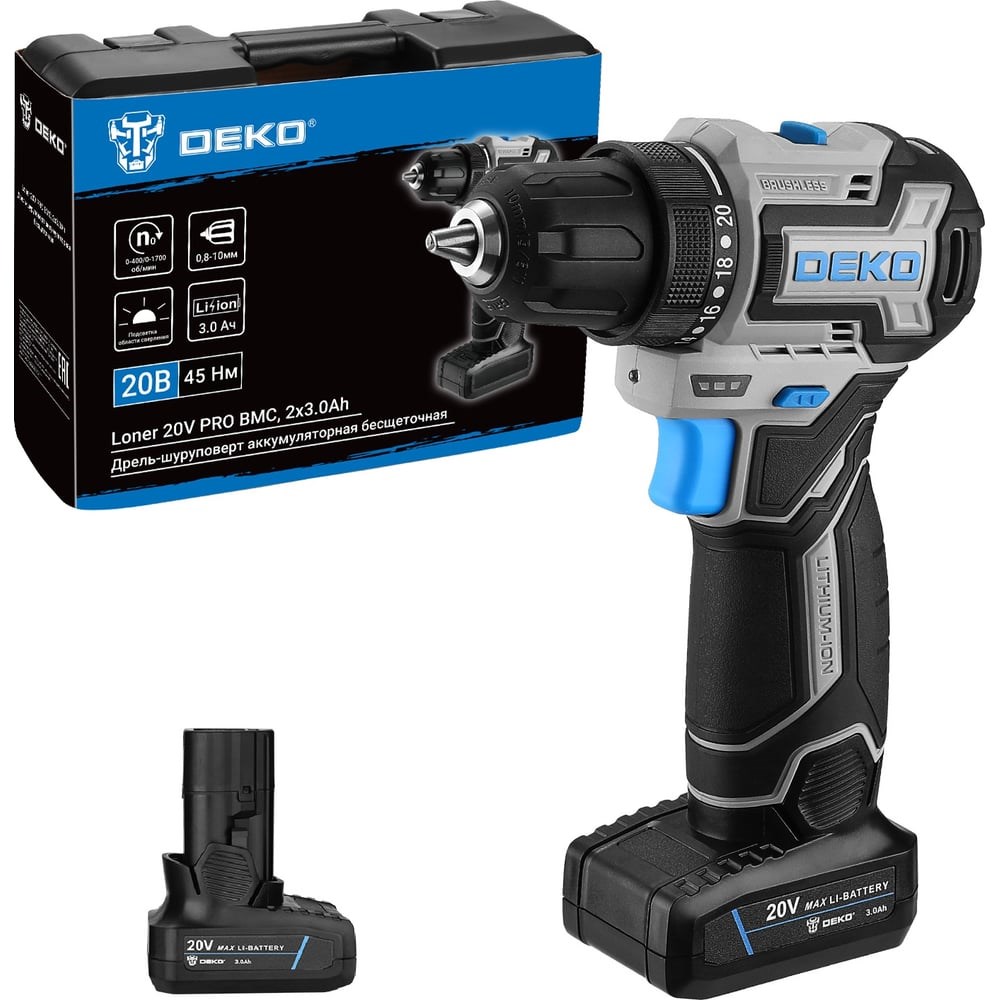 Дрель-шуруповерт аккумуляторная бесщеточная компактная DEKO Loner 20V PRO в кейсе, 20В, 2x3.0Ач используется при строительных, слесарно-монтажных работах. Помогает быстро высверливать отверстия нужного диаметра как на деревянной, так и металлической поверхности, быстро вкручивать или извлекать крепеж.Технические характеристики:Емкость аккумулятора: 3000 мАчЧастота вращения: 0-400/0-1700 об/минМакс. крутящий момент: 45 НмЧисло ступеней крутящего момента: 20+1Размер зажимаемой оснастки: 0,8-10 ммМакс. диаметр сверления (дерево): 24 ммМакс. диаметр сверления (металл): 12 ммИнструмент совместим с аккумуляторами: - DEKO UNV - Makita 18В Li-Ion тип BL-1830, BL-1840, BL-1850, BL-1860 - С аккумуляторами от бесщеточного инструмента DEKO, произведённым не ранее 2024 года