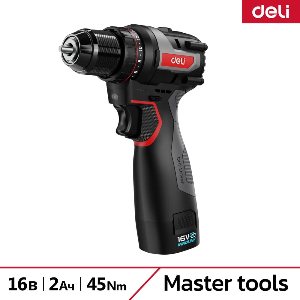 Аккумуляторная дрель-шуруповёрт Deli DE-DZ16-1D2 Мощный и универсальный инструмент с бесщёточным двигателем — для профессионалов и домашних мастеров Идеален для закручивания шурупов, сверления дерева, металла и других материаловДва Li-Ion аккумулятора 16 В / 2 Ач с технологией Innolink — стабильная мощность, быстрая смена и минимум простоев. Бесщёточный двигатель Ultra Motor развивает крутящий момент 45 Нм — уверенно справляется с жёсткими задачами без перегрева.Два аккумулятора 16 В / 2 Ач — непрерывная работа без ожидания зарядкиБесщёточный двигатель Ultra Motor — максимальная мощность, долговечность и тишинаКрутящий момент 45 Нм — подходит для твёрдых материалов и больших саморезовТехнология Innolink — интеллектуальная безопасность и совместимость аккумуляторовБыстрозажимной металлический патрон 10 мм — мгновенная смена свёрл и битКомпактный эргономичный дизайн — комфорт при длительной работеУдобная сумка и клипса на пояс — всё в одном месте, легко носить на объектDeli DE-DZ16-1D2 — это дрель-шуруповёрт, которую берёшь и сразу чувствуешь: мощная, надёжная и стильная. Профессионалы и домашние мастера говорят просто: «Крутит всё и не подводит». Автономная, удобная и с запасом мощности на весь день.