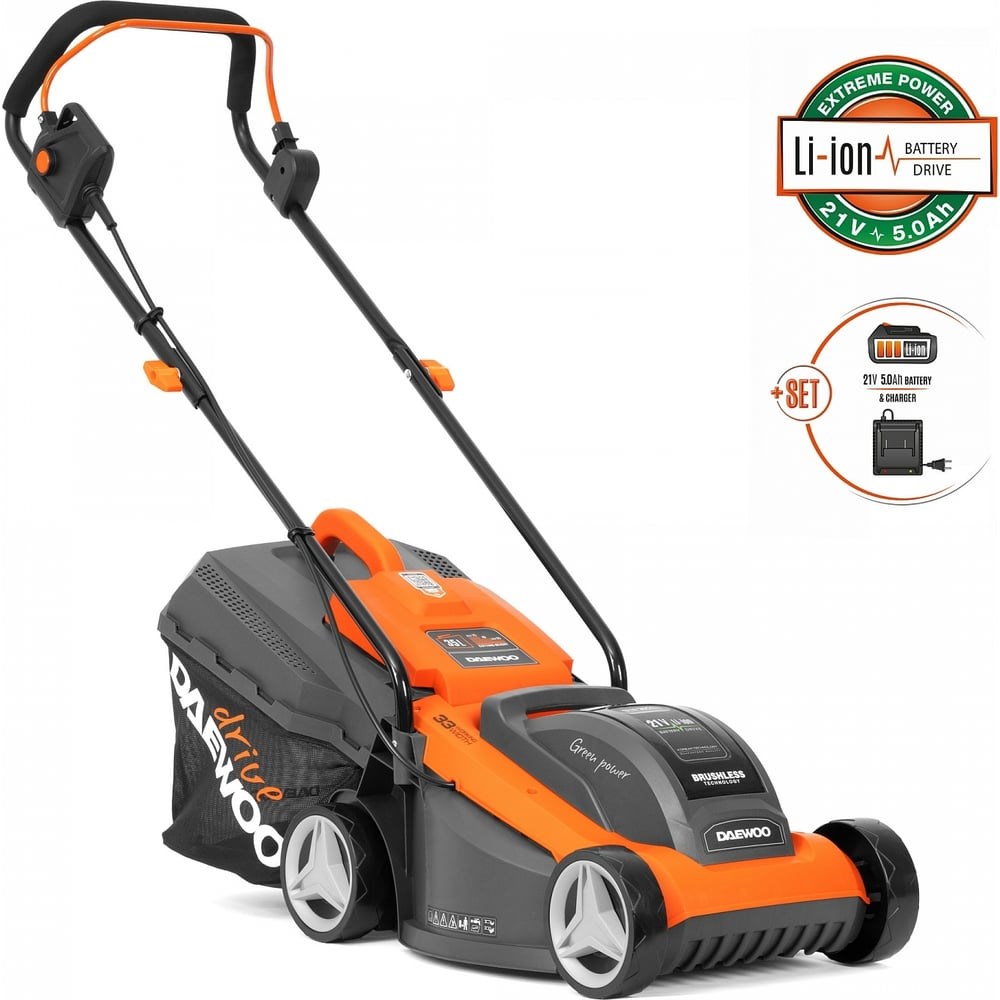 Экологичный двигатель DAEWOOКорпус из ударопрочного ABS-пластикаАэродинамический нож из высокопрочной сталиНизкий уровень шума и вибрацииВместительный травосборник на 35 литровСкладная конструкцияВ комплектацию данного товара включена Батарея аккумуляторная DABT 5021Li (21В, 5,0 Ач) и зарядное устройство.