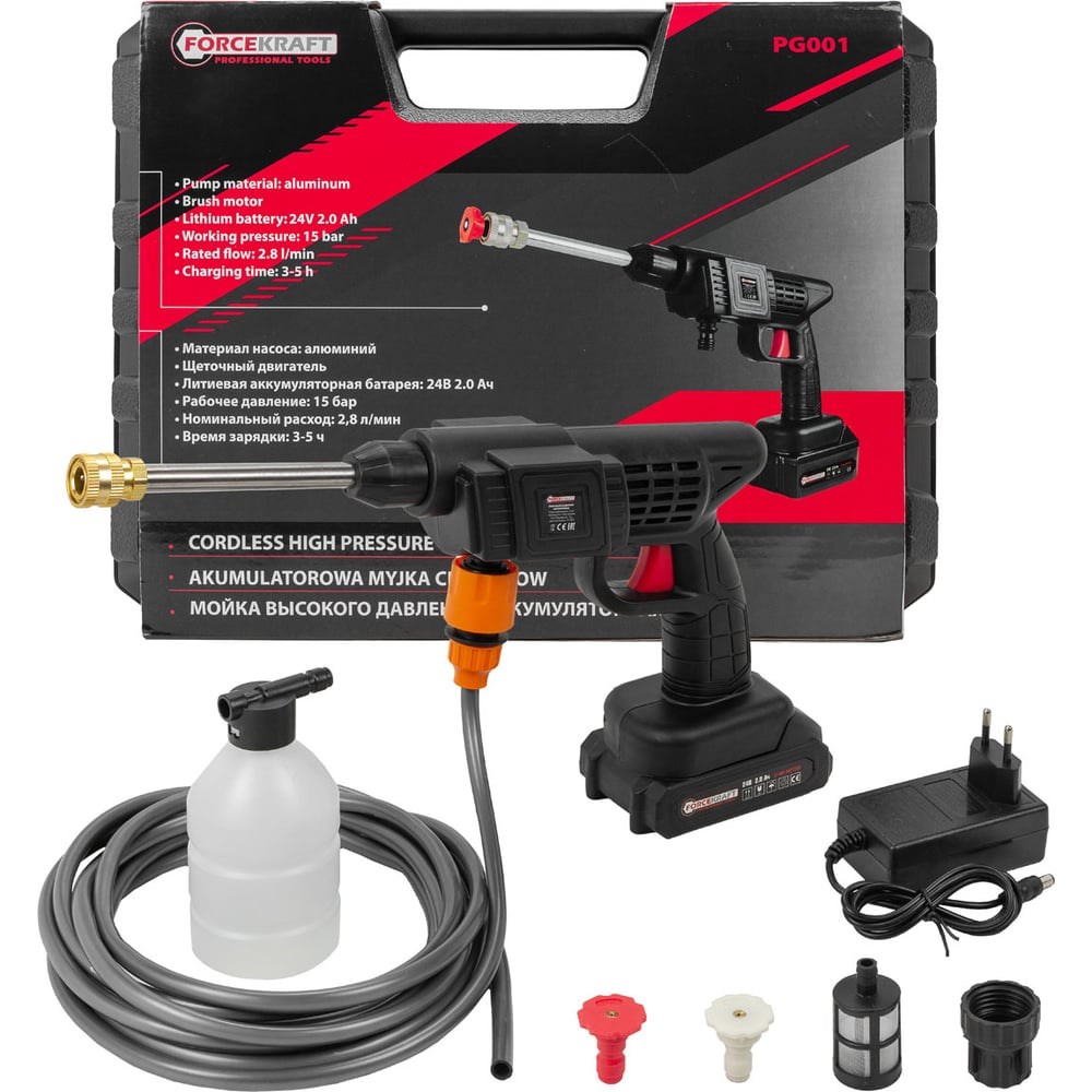 Мойка высокого давления Forcekraft — универсальный инструмент для гаража, дома и дачи, идеально подходящий для мойки автомобилей, мотоциклов и велосипедов.ХарактеристикиАккумулятор: Литиевая батарея емкостью 2000 мАч для длительной работы без подзарядки.Рабочее давление: До 15 бар, что позволяет эффективно справляться с загрязнениями.Номинальный расход воды: 2.8 литра в минуту, обеспечивающий оптимальное соотношение расхода воды к производительности.Время зарядки: 3-5 часов.Многофункциональность: Используйте пистолет не только для мойки, но и для полива садовых растений с рассеивающей насадкой.Эффективные аксессуары: Спринклер высокого давления для мойки авто и твердых поверхностей, а пеногенератор для быстрого нанесения моющего средства.Прочный корпус: Выполнен из прочного пластика, защищающего от механических повреждений.Компактность: Легко помещается в гараже, бытовке или багажнике автомобиля, что обеспечивает удобное хранение.КомплектацияВесь набор поставляется в надежном пластиковом кейсе, где у каждого инструмента и аксессуара есть свое место.Мойка высокого давления Forcekraft — надежный и удобный инструмент, который значительно упростит уход за вашим транспортом и садом.