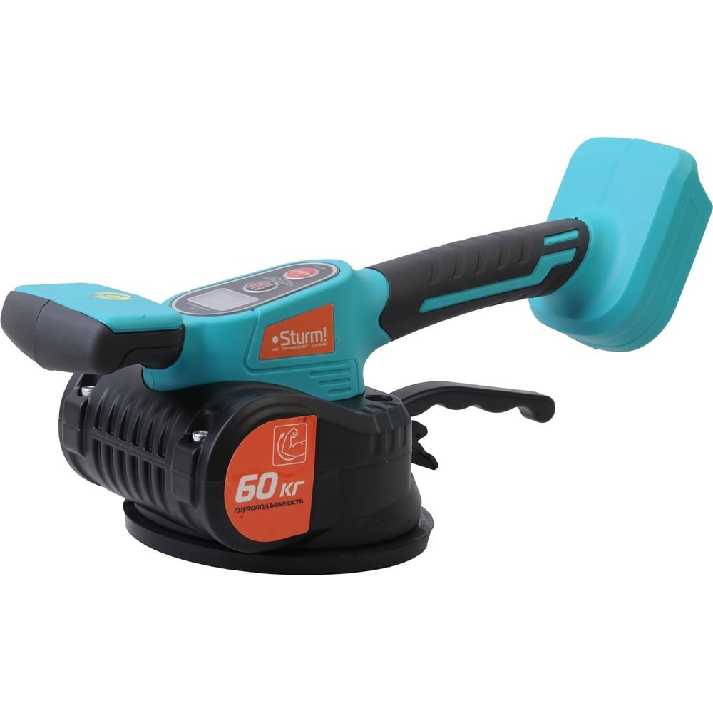 Аккумуляторная виброприсоска для укладки плитки Sturm! TV1860— профессиональный инструмент, разработанный для переноса, подъема, выравнивания при укладке напольной и настенной плитки больших размеров и веса, керамогранита, гранитных и мраморных плит. Грузоподъемность— 60кг. Диаметр подошвы— 123мм. Небольшой размер и легкий вес делают данный инструмент очень удобным в использовании. Постоянная и равномерно распределенная вибрация не повреждает плитку, даже если в ней были выполнены отверстия или разрезы больших размеров. 12 режимов регулировки частоты вибрации для выполнения различных операций. Встроенный пузырьковый уровень для легкого измерения угла отклонения поверхностей. Данная модель является частью системы 1BatterySystem и совместима со всей линейкой аккумуляторного инструмента. Для вашей выгоды модель поставляется без аккумулятора и зарядного устройства.
