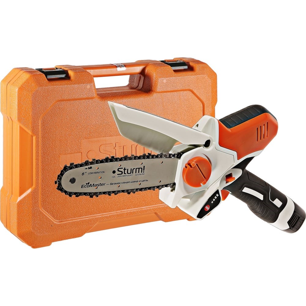 Аккумуляторная цепная пила Sturm! CSC1804 прекрасно справится собрезкой веток деревьев ипростыми столярными работами. Главная особенность цепной пилы является наличие безмасляной пильной гарнитуры. Это гарантирует немало преимуществ: пила не нуждается в заправке маслом и, как следствие, в постоянном контроле его уровня, исключается необходимость регулярной прочистки маслоподающего канала от опилок, инструмент не оставляет масляные пятна при транспортировке или хранении. Высокая производительность реза обеспечивается 1/4 ″ пильной цепью. Эргономичная рукоять спротивоскользящей прорезиненной поверхностью гарантирует надежный хват для комфортной работы спилой. Индикатор заряда аккумулятора— для лучшего контроля работы синструментом. Откидной защитный кожух делает работу спилой безопасной. При необходимости задействовать всю длину шины, кожух откидывается под углом90°.