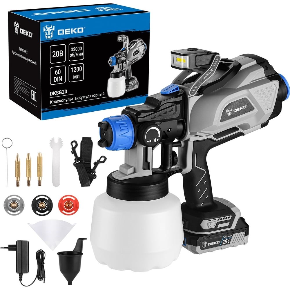 Краскопульт аккумуляторный DEKODKSG20 используется для обработки поверхности водно-меловыми и водно-известковыми составами при строительно-отделочных работах, при опрыскивании и побелке садов, дезинфекции помещений. Характеристики устройства: Напряжение: 20 В Емкость батареи: 3000 мАч Расход воздуха: 160 л/мин Расход краски: 590 мл/мин Объем бака: 1200 мл Скорость: 32000 об/мин Диаметр сопла: 1мм, 1,8мм, 2.5 мм Максимальная вязкость: 60 DIN Способ распыления: HVLP Наличие подсветки: да Инструмент совместим с аккумуляторами: DEKO UNV Makita 18В Li-Ion тип BL-1830, BL-1840, BL-1850, BL-1860 С аккумуляторами от щеточного инструмента DEKO, произведённый не ранее 2024 года"