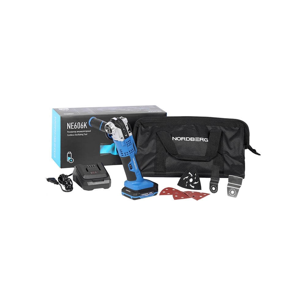 Реноватор аккумуляторный NORDBERG NE606K – многофункциональный инструмент для выполнения большого спектра отделочных и реставрационных работ в профессиональном и домашнем использовании.ФУНКЦИОНАЛПозволяет шлифовать поверхности, зачищать швы, снимать и удалять поверхностные материалы (краску, шпаклевку, герметик и т.д.), полировать, зачищать, точить, пилить и резать различные материалы.ПРЕИМУЩЕСТВАЛитиево-ионный аккумулятор емкостью 2 А·ч и напряжением 20 В, совместимый с аккумуляторным инструментом NORDBERG*Большой выбор насадок для выполнения различных работРегулировка скорости для удобной работы с необходимым материаломЧастота колебаний 5000-19000 кол\минБезопасное использование благодаря установленной специальной насадке с высокочастотным колебательным движением под небольшим угломПрочный алюминиевый корпус редуктораДополнительная рукоятка для уверенного удержания реноватораИспользование аккумулятора обеспечивает автономность и маневренность оборудования, освобождая от контроля за кабелем во время работыУДОБСТВО ИСПОЛЬЗОВАНИЯМягкая рукоять с нескользящим покрытием и компактные размерыЗарядное устройство обеспечивает быструю подзарядку аккумулятораМногофункциональный инструмент NORDBERG NE606K позволит легко и быстро выполнить множество различных операций даже при отсутствии доступа к электричеству. * кроме моделей NORDBERG NE808, NE812