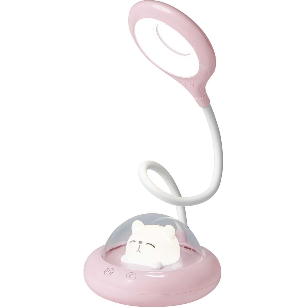 Аккумуляторный настольный светильник-ночник ФОТОН КОСМИЧЕСКИЙ КОТ, розовый 25073 с сенсорным управлением, цветовой температурой 3000К и тремя режимами яркости в розовом цвете удобен и прост в использовании и отлично подойдет для детской комнаты. Светильник имеет 3 уровня яркости и 3 режима работы: светильник, ночник, а также одновременное включение светильник + ночник. Благодаря гибкой ножке может поворачиваться в разные стороны и менять угол освещения. Питание: аккумулятор Li-ion, емкость 1200 мАч, подзарядка через USB провод (в комплекте). Время работы без подзарядки: 5 ч.