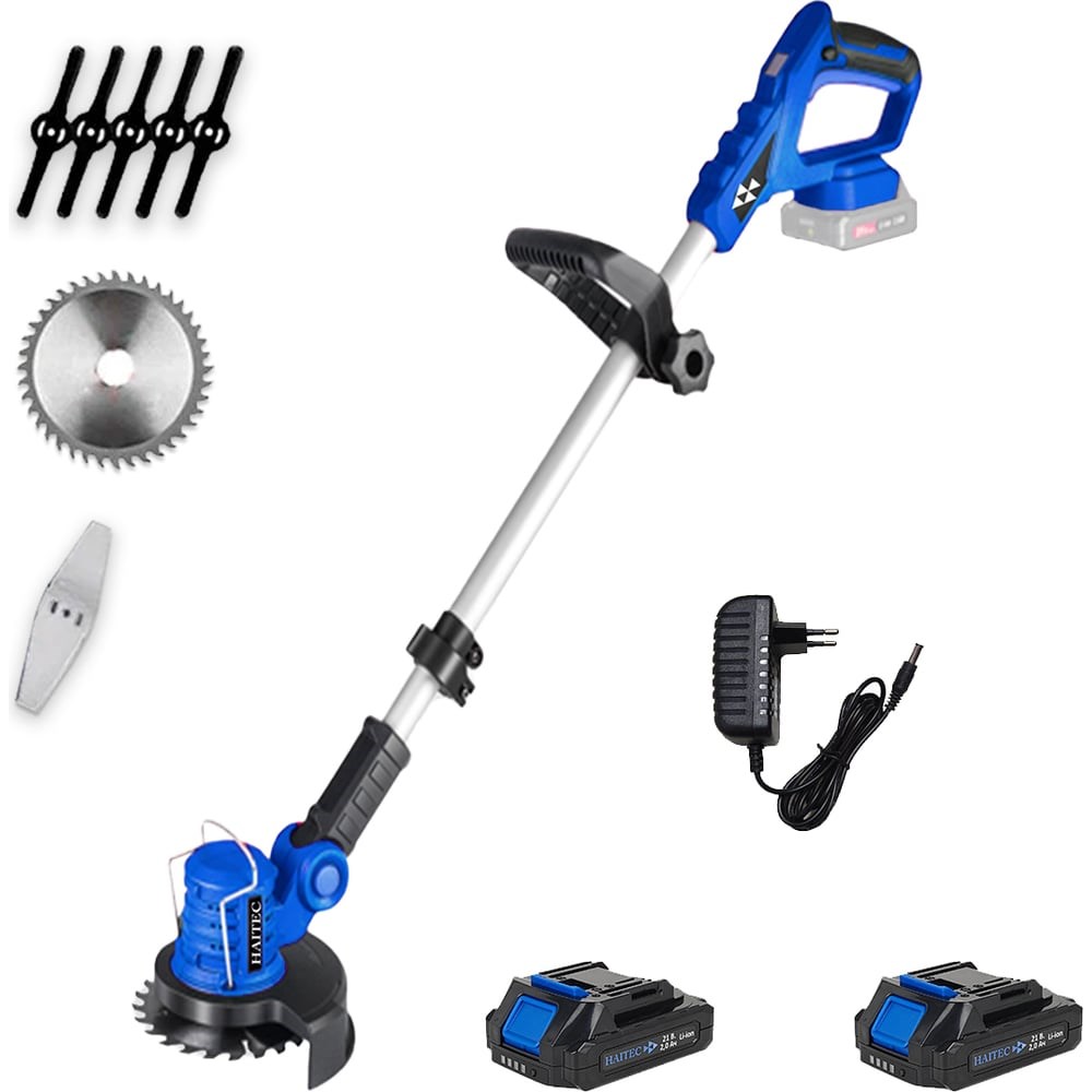 Аккумуляторный триммер HAITEC HT-AMS22Li - легкий, мощный и удобный инструмент для ухода за газонами и клумбами с литий-ионным аккумулятором. 2 аккумулятора обеспечивают в два раза более длительную работу. Пока один аккумулятор на зарядке, вы можете продолжать работать с другим. Небольшой вес, регулируемая боковая ручка D-образной формы с элементами из прорезиненного материала добавляют удобства оператору, снижают нагрузку на руку и обеспечивают более длительное использование инструмента. Аккумулятор обеспечивает длительную работу без подзарядки и высокую частоту вращения 7500 об./мин. Он легко справится даже с очень густой травой. Ширина скашивания составляет 18 см. Защитный кожух предотвращает вылет скошенной травы и мусора на оператора. Регулировка высоты телескопической штанги позволить настроить триммер индивидуально под себя, а дополнительная рукоятка сделает вашу работу с ним комфортной в течение долгого времени.Богатая комплектация режущих инструментов(круглое металлическое лезвие, прямой металлический нож и 5 пластиковых ножей) позволяют скашивать различные виды растений: кусты, борщевик, траву т.д. С триммером HAITEC HT-AMS22Li у вас отлично получится поддерживать порядок на дачном участке или на газонах городских парков и скверов.*Вся аккумуляторная техника HAITEC совместима с аккумуляторами типа Makita LXT.
