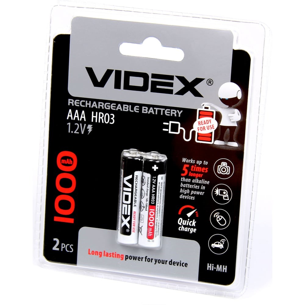 Аккумуляторы Videx HR03/AAA 1000mAh 2BL LSD, низкий саморазряд VID-HR03-1000LSD никель-металл-гидридные (Ni-MH) перезаряжаемые источники питания. В зависимости от типа и ёмкости, могут использоваться в устройствах высокого и низкого энергопотребления. LSD (low self-discharge) аккумуляторы - источники питания с низким саморазрядом и длительным сроком хранения. Поставляются предварительно заряженными. Такие аккумуляторы теряют всего от 0,04% до 0,1% заряда в день, имеют высокую устойчивость к морозам, дают возможность работать с высокими токами разряда, которые могут на порядок превышать ёмкость аккумулятора.