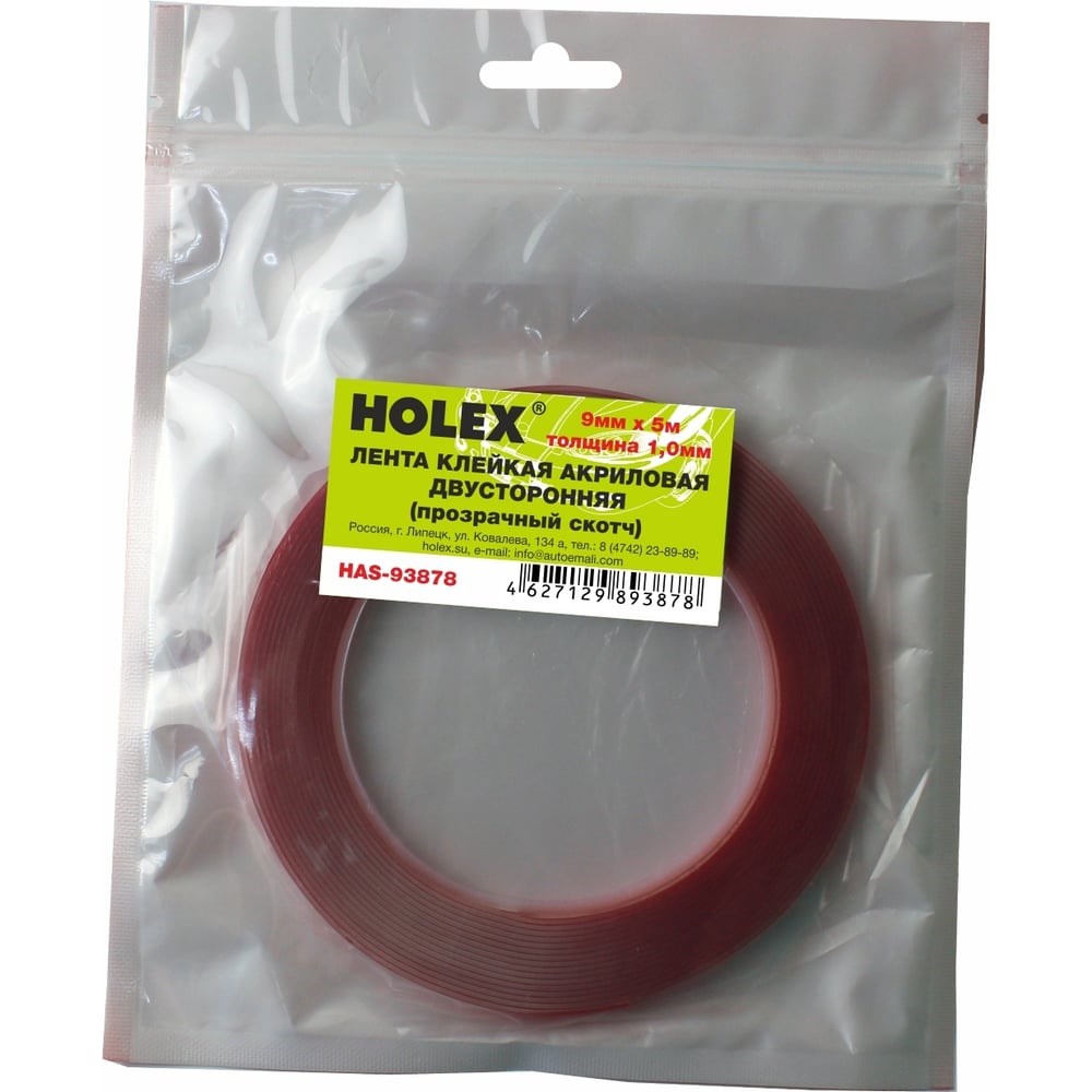 Акриловая двусторонняя клейкая лента Holex 9 мм х 5 м, 1 мм, прозрачная, блистер HAS-93878 применяется для крепления наружных и внутренних отделочных элементов и боковых профилированных деталей кузова (молдингов, обвесов, эмблем, значков, зеркал заднего обзора, балансировочных грузиков). Обладает следующими характеристиками: подходит для соединение деталей из разнородных материалов, для внутреннего и наружного применения; прочность склеивания при динамическом сдвиге: 5.9 кг/см2; долговременная температурная стойкость: +90 °C; кратковременная температурная стойкость: +150 °C; стойкость к воздействию растворителей - не снижается; стойкость к воздействию УФ-излучения - хорошая; влагостойкость - отличная.