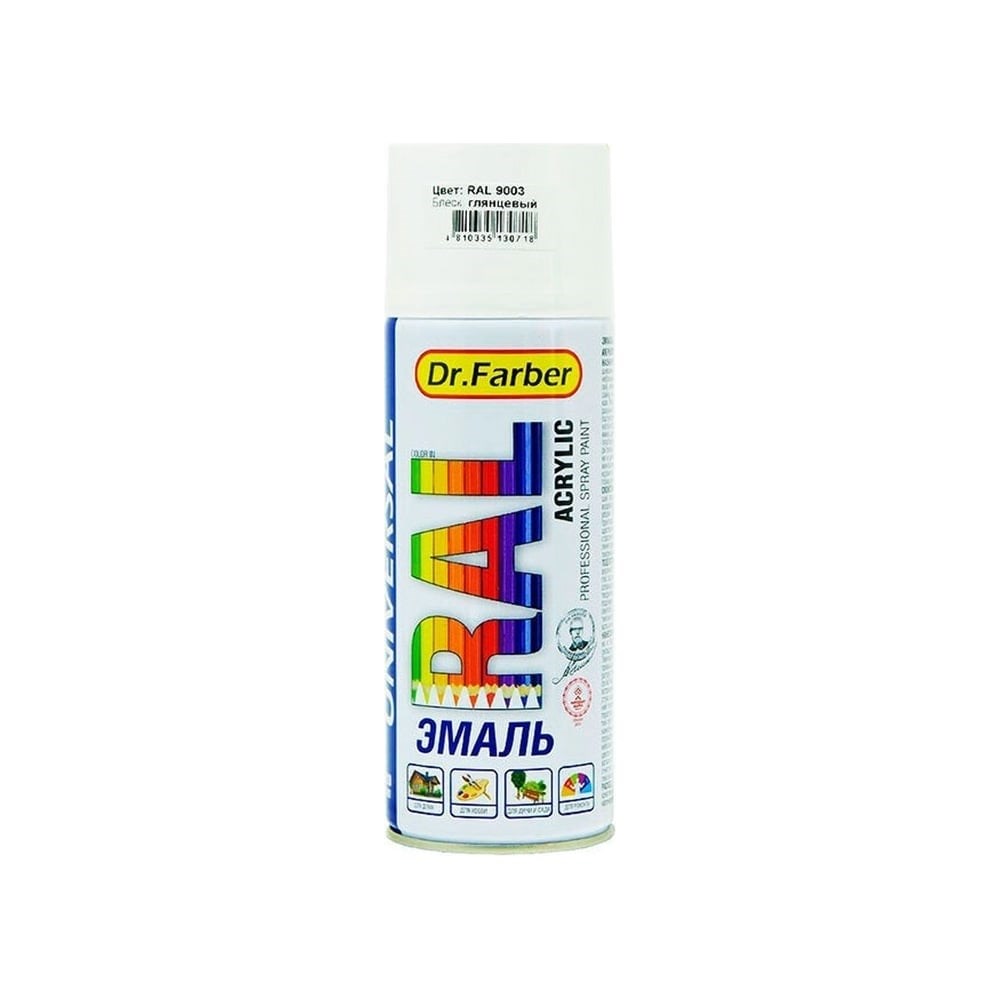 MAV Краска RAL 9003 сигнальный белый Dr. Farber акриловая глянцевая применяется для быстрого и равномерного окрашивания объектов и бытовых изделий, элементов ландшафтного, интерьерного дизайна, не подвергающихся механическим нагрузкам.Рекомендуется нанесение по: бетонным, кирпичным, оштукатуренным, гипсокартонным, из искусственного и натурального камня, неглазурированной керамики, щебня; по металлическим поверхностям, в т. ч. окрашенным ранее порошковыми красками (наружные стенки холодильников, стиральных машин, микроволновых печей и т.п.), по натуральным плотным тканям (плакаты, элементы одежды), эксплуатирующимся в атмосферных условиях и внутри помещений.Окраску проводить на открытом воздухе, в производственных помещениях при наличии вентиляции.Подготовка поверхности: окрашиваемую поверхность тщательно очистить от жировых и других загрязнений, ржавчины, окалины, старой отслоившейся краски, зашкурить, обезжирить растворителем и высушить.Нанесение: перед окраской баллон встряхивать в течение 3 минут после появления стука шарика. Распылять в вертикальном положении тонкими слоями с расстояния 25 - 30 см при температуре от 5 ºС до 30 ºС.Распыление проводить сначала по горизонтали, затем, по вертикали, количество слоев может варьироваться от 1 до 3. После каждого применения следует очистить клапан: перевернуть баллон распылителем вниз и нажать на клапан в течение 2 - 5 сек. ВРЕМЯ ВЫСЫХАНИЯ: при температуре (20 ± 2) °C – 1 ч. Допускается нанесение второго слоя через 5 - 7 мин.