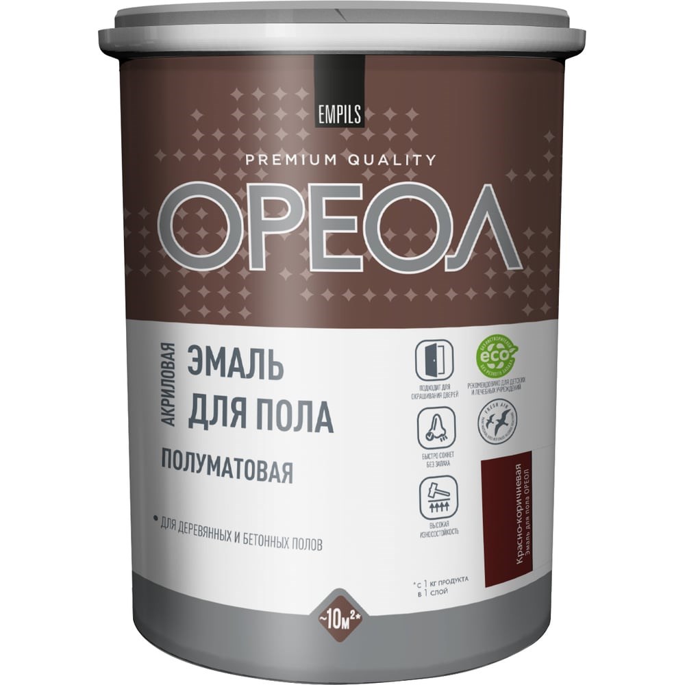 Акриловая эмаль для пола Ореол (полуматовая; красно-коричневая; 0.9 кг) 73367 применяется для окрашивания деревянных и бетонных полов в бытовых помещениях. Возможно нанесение на ранее окрашенные, в том числе алкидными лакокрасочными материалами, поверхности. Эмаль готова к применению. Не имеет резкого запаха. Быстро сохнет. Покрытие эмали устойчиво к воздействию бытовых моющих средств, обладает высокими декоративными и защитными свойствами, образует поверхность, стойкую к механическому воздействию (удару, царапинам, сколам), влаге и истиранию. Допускается нанесение внутри и снаружи (защищенных от прямых атмосферных воздействий) помещений. Может применяться для окраски стен, дверей, мебели и других поверхностей, не подверженных плотному соприкосновению.