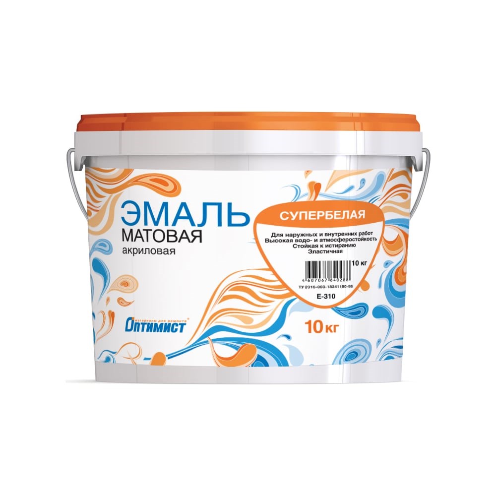 Акриловая эмаль Оптимист (матовая; супербелая; 10 кг) OPE017 предназначена для наружных и внутренних работ по деревянным, бетонным, кирпичным, оштукатуренным и другим поверхностям. Рекомендуется применять на поверхностях, подвергающихся атмосферным и механическим нагрузкам. Практически без запаха, обладает высокой водо- и атмосферостойкостью, подходит для финишного окрашивания радиаторов, труб водяного отопления и водоснабжения. Рекомендуется двухслойное нанесение, с сушкой между слоями 12 часов. Расход 150-200 г/кв.м в зависимости от впитывающей способности основания.