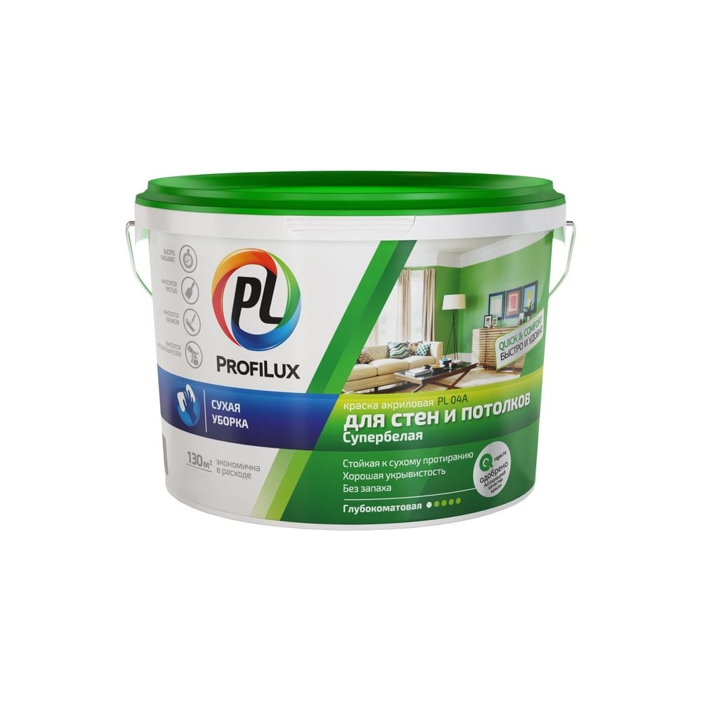 Краска Profilux ВД PL 04А акриловая, белая, 14 кг МП00-004685 предназначена для декоративного окрашивания стен и потолков внутри помещений, не подверженных сильным эксплуатационным нагрузкам. Экологически чистый состав подходит для всех видов минеральных оснований: асбестоцемент, газобетон, гипсовые штукатурки, гипсокартонные плиты. Краска отличается высокой укрывистостью и хорошей адгезией. Финишное гладкое покрытие не мелит и не желтеет со временем, допускает сухую уборку (протирка тканью).