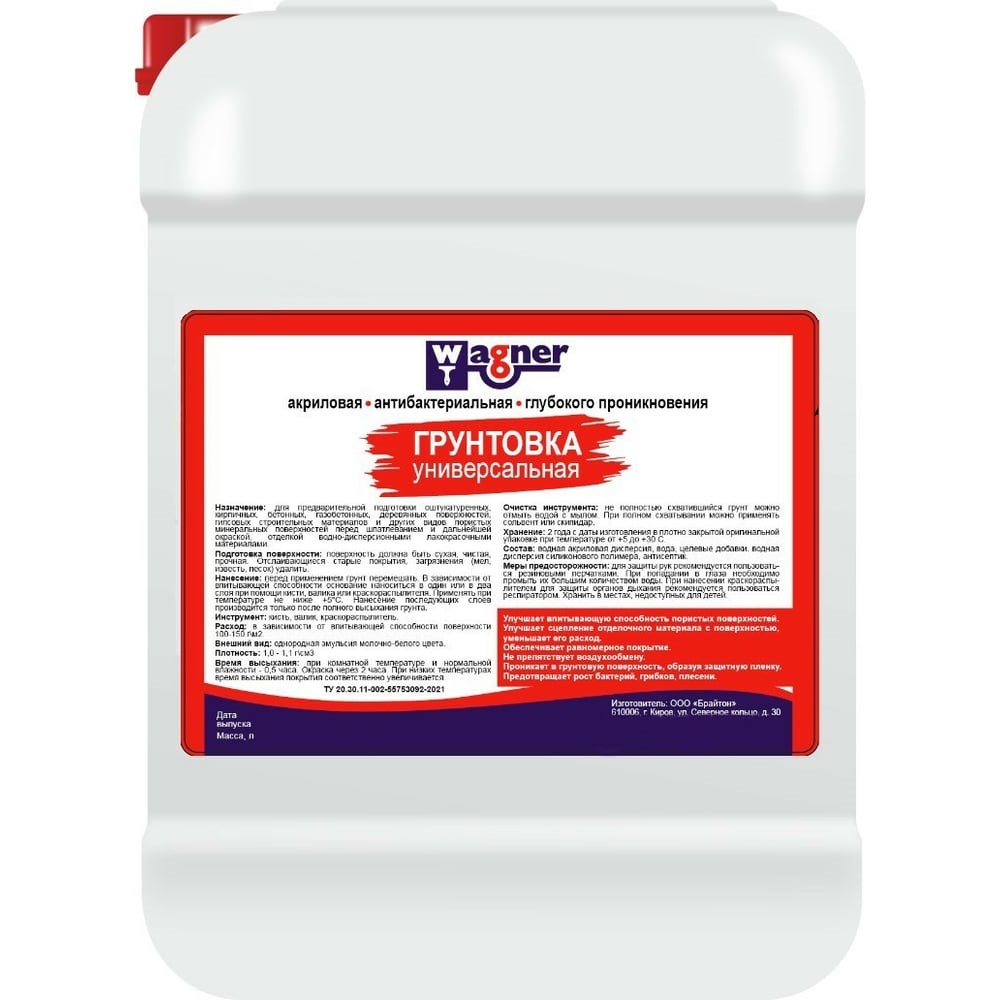 Акриловая универсальная грунтовка Wagner глубокого проникновения, 10 л арт.3087 предназначена для предварительной подготовки оштукатуренных, кирпичных, бетонных, газобетонных, деревянных поверхностей, гипсовых строительных материалов и других видов пористых минеральных поверхностей перед шпатлеванием и дальнейшей окраской, отделкой водно-дисперсионными лакокрасочными материалами. Благодаря составу, продукт глубоко проникает в структуру основания и улучшает впитывающую способность пористых поверхностей, а также обеспечивает отличные адгезионные свойства отделочного материала с поверхностью, уменьшает его расход.