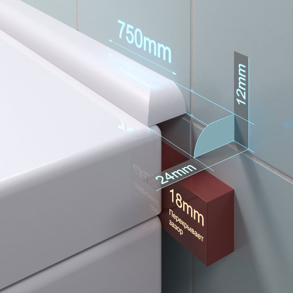 Акриловый Плинтус бордюр для ванной BNV ПШ24 75 сантиметров, правая сторона 4603320007764 - лаконичное решение для перекрытия зазора между плиткой и ванной. Акриловый камень из которого сделан бордюр - это твердый, цельный материал. Прост в монтаже и уходе, не меняет свой цвет и форму. Не допускает появления грибка и плесени. Для распила потребуется ножовка по металлу или торцовочная пила с диском по дереву или алюминию, монтаж производится на герметик или водостойкий клей. Ширины бордюра - 24 мм хватит, для того чтобы перекрыть зазор до 20 мм. Благодаря своим оптимальным размерам, он не только защитит от попадания воды в щели и предотвратит распространение плесени, но и хорошо скроет все мелкие недостатки. Для облицовки ванной бордюрами с 3-х сторон понадобится: Прямой бордюр 180 см, Левый бордюр 75 см, Правый бордюр 75 см.