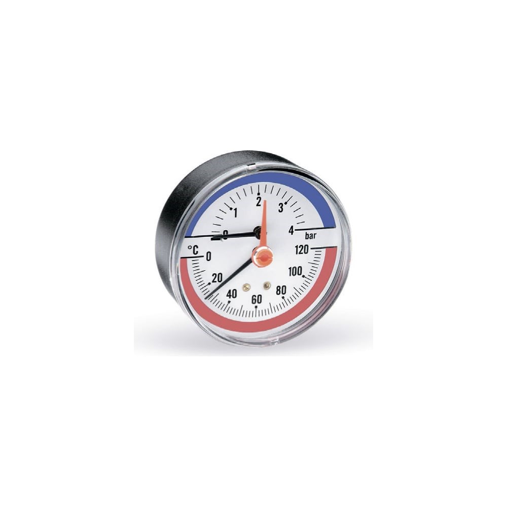 Термоманометр аксиальный F+R818 10009464 применяется для комбинированного измерения температуры и давления в системах отопления и водоснабжения, котлах. Состоит из пластмассового ABS корпуса с акриловым стеклом, оснащен красной указательной стрелкой, с автоматическим запорным клапаном. Циферблат отмечен черной шкалой на белой алюминиевой пластине.