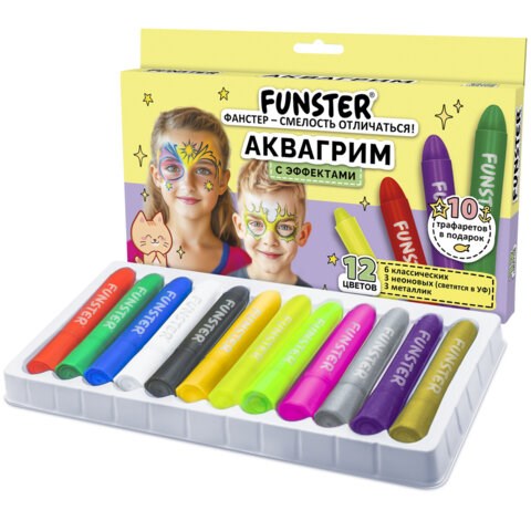 Аквагрим для лица и тела, 12 цветов (6 классических + 3 неон + 3 метал), 10 трафаретов, FUNSTER (ФАНСТЕР), 192575
