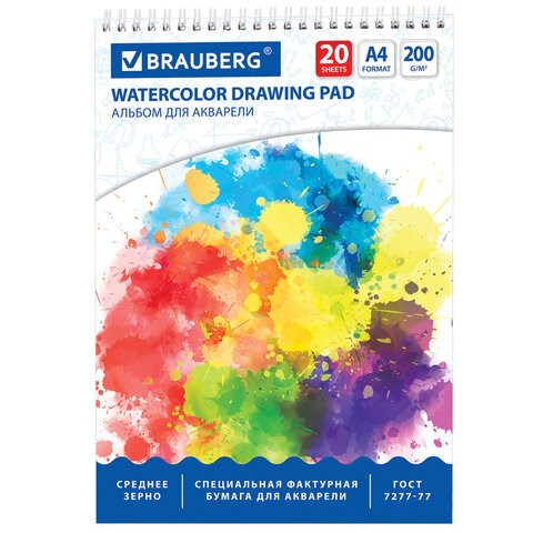 Альбом для акварели А4 20 л., бумага 200 г/м2, гребень, твердая подложка, BRAUBERG, "Краски", 126308