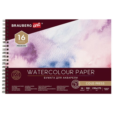 Альбом для акварели, бумага 300 г/м2, 190х270 мм, среднее зерно, 16 листов, гребень, BRAUBERG ART "PREMIERE", 113212