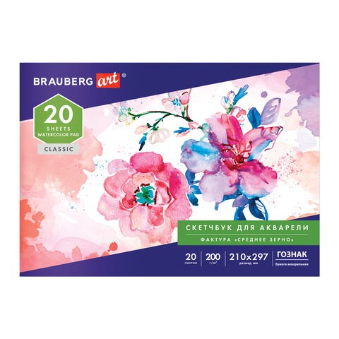 Альбом для акварели, бумага ГОЗНАК СПб 200 г/м2, 210x297 мм, 20 л., склейка, BRAUBERG ART, 106141