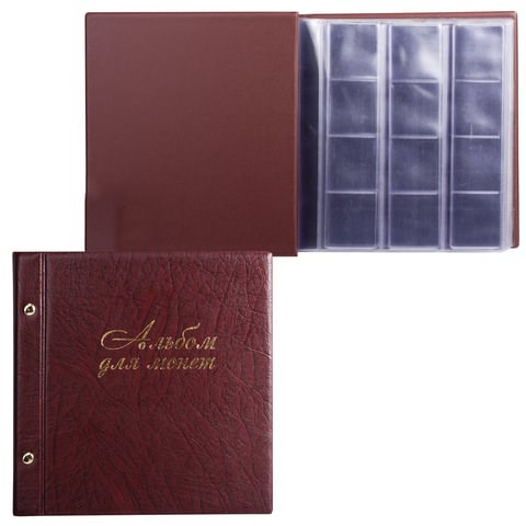 Альбом для монет и купюр на винтах универсальный, 224х224 мм, на 216 монет до D - 45 мм, выдвижные карманы, коричневый, "ДПС", 2855-204