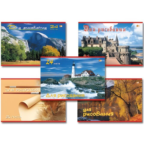 Альбом А4 формата, на скобе. Внутренний блок - 24 листа, офсетная бумага 100 г/м2. Обложка изготовлена из плотной офсетной бумаги 120 г/м2. Поставляется в 5 вариантах дизайна без возможности выбора.
