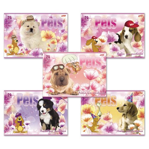 Альбом для рисования, А4, 24 листа, скоба, обложка картон, HATBER, 205х290 мм, "Любимцы", 004051, 24А4В