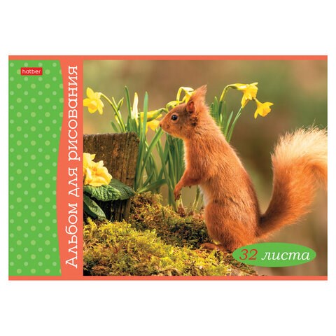 Альбом для рисования А4, 32 л., скоба, обложка картон, HATBER, 205х290 мм, "Белочка пришла" (5 видов), 091519, 32А4В