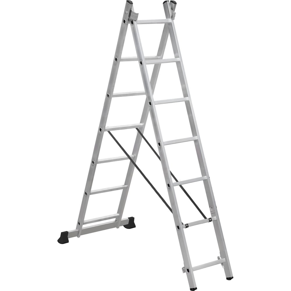 Алюминиевая двухсекционная лестница Scala 2х7 Sc 2007 применяется в строительстве, в саду. Небольшой вес позволяет легко транспортировать изделие с места на место. Поперечная траверса и противоскользящие наконечники надежно фиксируют лестницу на поверхности.