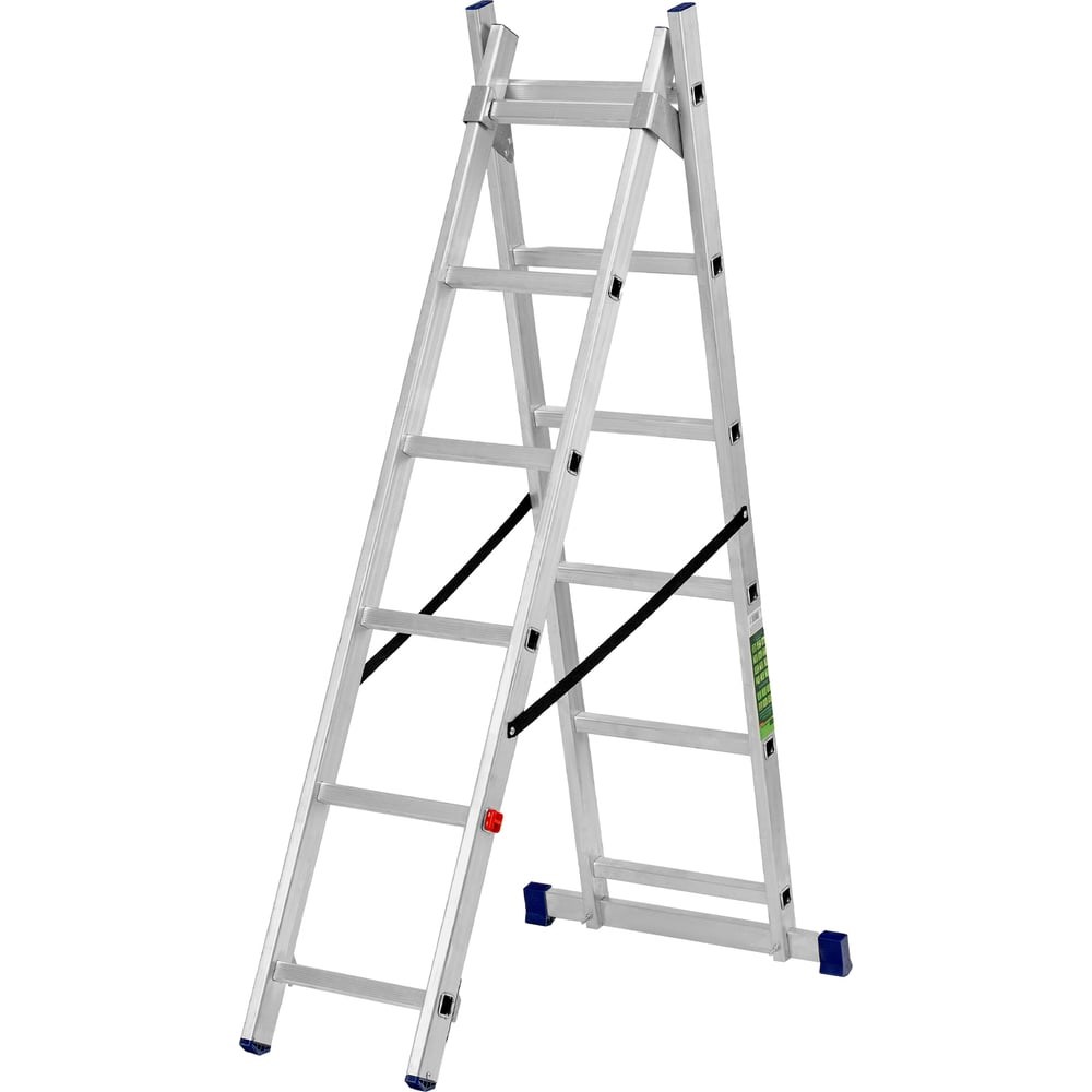 Алюминиевая двухсекционная лестница СИБРТЕХ 2х6 ступеней 97906 подходит для выполнения работ на высоте до 3 м. При изготовлении использовался прессованный алюминиевый профиль прямоугольного сечения. Это гарантирует изделию коррозионную стойкость и прочность. Защиту от скольжения на рабочих поверхностях обеспечивают заглушки и широкая траверса.