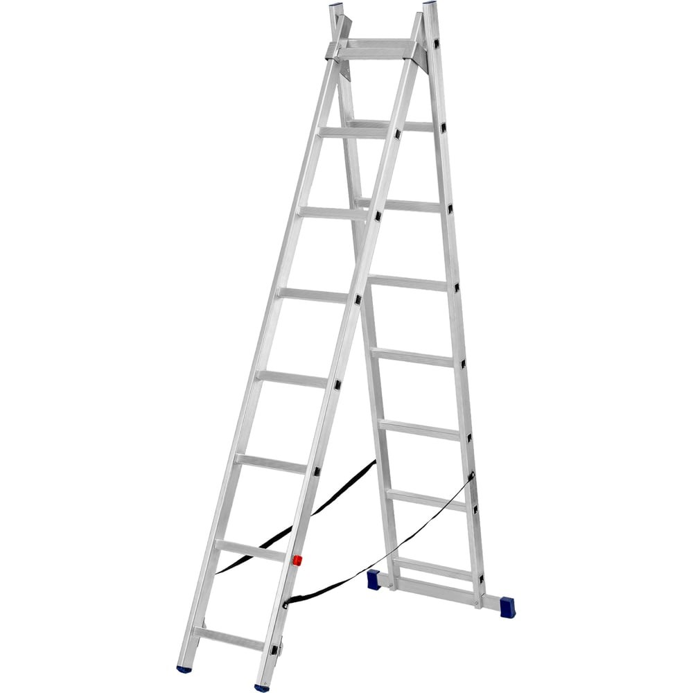 Алюминиевая двухсекционная лестница СИБРТЕХ 2х8 ступеней 97908 подходит для выполнения работ на высоте до 4.15 м. При изготовлении использовался прессованный алюминиевый профиль прямоугольного сечения. Это гарантирует изделию коррозионную стойкость и прочность. Защиту от скольжения на рабочих поверхностях обеспечивают заглушки и широкая траверса.