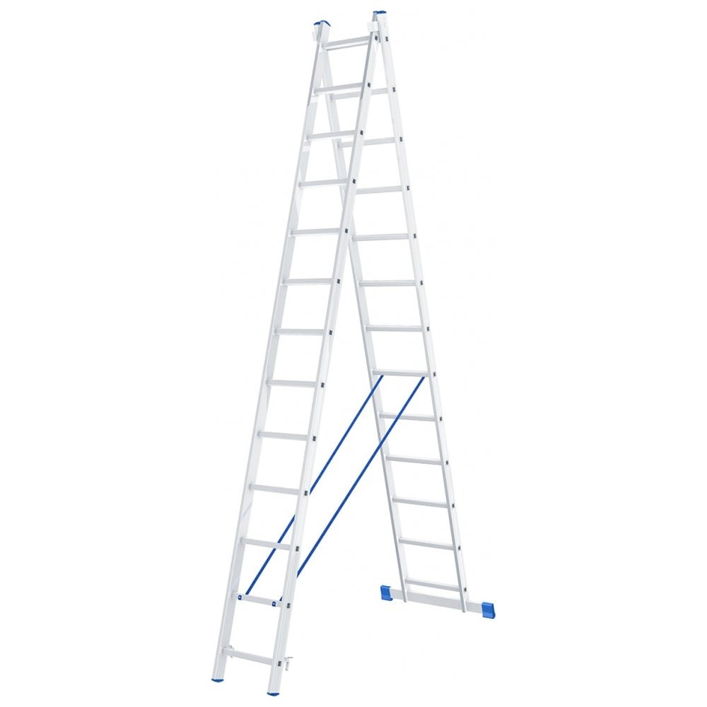 Алюминиевая двухсекционная лестница СИБРТЕХ 2х13 ступеней 97913 подходит для выполнения работ на высоте до 6.7 м. При изготовлении использовался прессованный алюминиевый профиль прямоугольного сечения. Это гарантирует изделию коррозионную стойкость и прочность. Защиту от скольжения на рабочих поверхностях обеспечивают заглушки и широкая траверса.