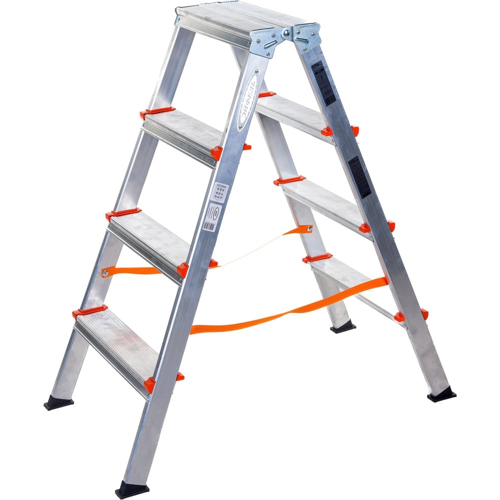 Алюминиевая cтремянка Эйфель Библио 80 - 204 отличается повышенной жесткостью направляющих и ступеней для выдерживания больших нагрузок. Рифленые ступени позволяют меньше переставлять приспособление во время работы. Нижние концы опор оснащены специальными упорами из высокопрочного полимерного материала.
