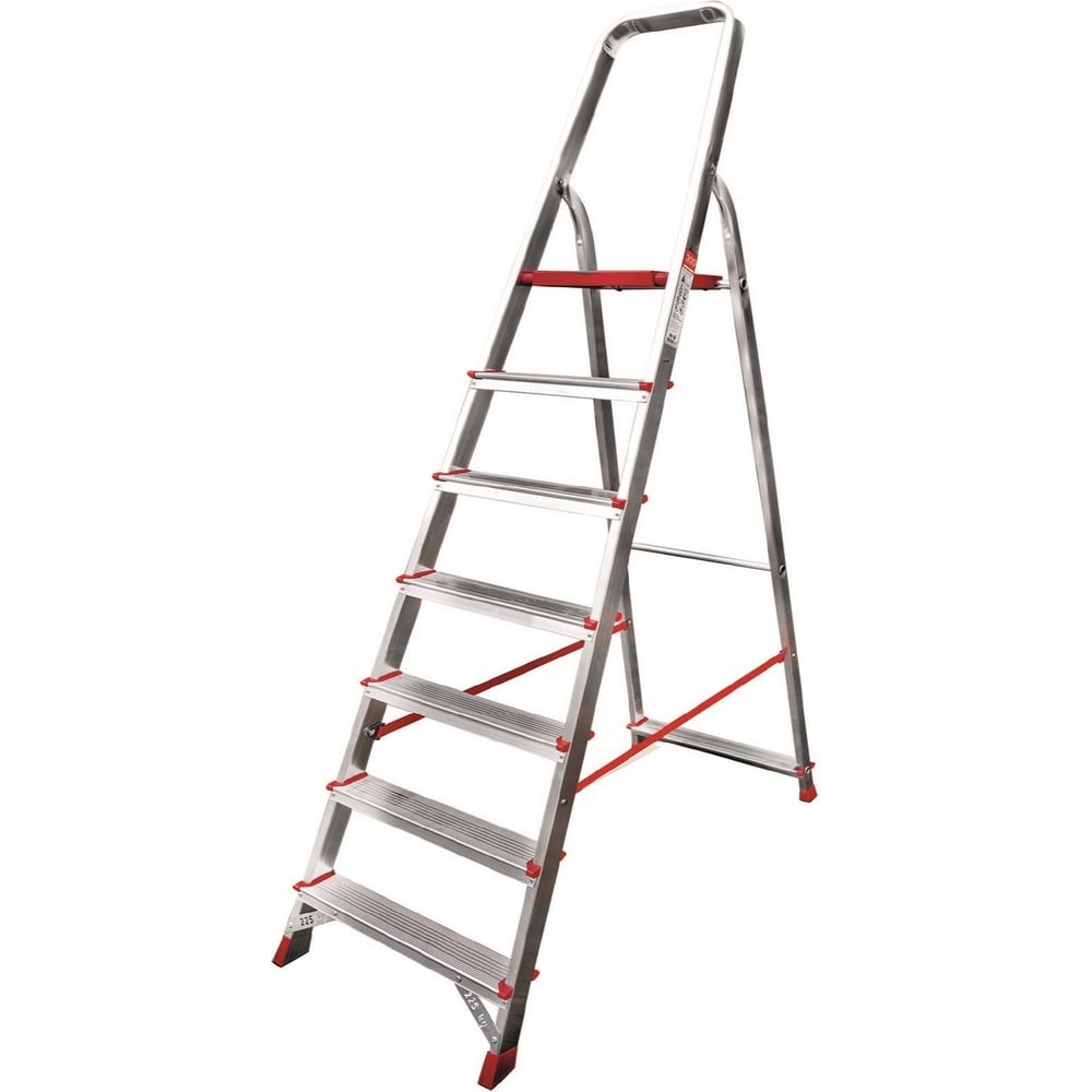 Стремянка предназначена для интенсивной эксплуатации. Устойчива на любой поверхности. Профилированные ступени обеспечивают уверенный подъем работника на высоту. Страховочные ремни придают конструкции жесткость и не дают стремянке сложиться. При хранении лестница не занимает много места, а благодаря небольшому весу легко транспортируется.