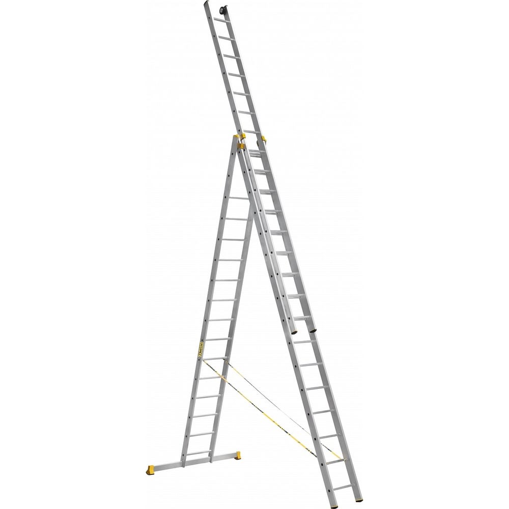 Лестница алюминиевая трехсекционная универсальная профессиональная– замечательный выбор для проведения работ на высоте. Тетивы, ступени, стабилизатор - изготовлены из высокопрочного алюминиевого сплава (ГОСТ 22233).Тетива имеет увеличенную толщину стенок и ширину профиля. Лестница - разборная. Ее конструкция позволяет изменять конфигурацию в зависимости от требований. Может использоваться как приставная лестница или стремянка. Узкая секция может применяться, как самостоятельная приставная лестница, что делает ее чрезвычайно универсальной и удобной. Алюминиевый сплав обеспечивает изделию прочность и легкость. Расположение ступеней создает оптимальные условия для подъема и безопасного удержания на высоте. *Лестницы моделей Р3 9316, 9318, 9320-компектуются дополнительно колесами. Идеальный помощник как на производстве, так в офисе, быту или на даче. Лестницу можно использовать вне помещения. Конструкция стойкая к воздействию неблагоприятных погодных условий благодаря коррозионностойким свойствам алюминия. на линейные размеры отклонение может составлять +-5 мм, на вес изделия +-5%