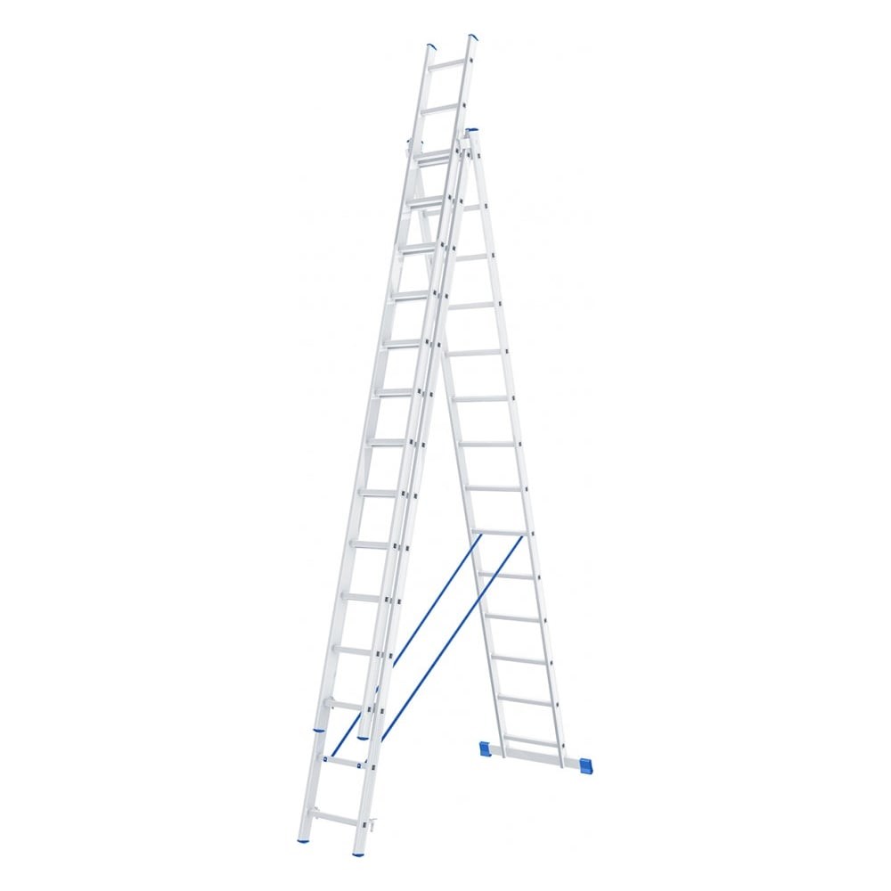 Алюминиевая трехсекционная лестница СИБРТЕХ 3х14 ступеней 97824 применяется для высотных работ, как покраска фасада дома, монтирование электроосветительных приборов, работа в саду и др. Трансформируется в четыре различные формы и подходит для выполнения работ на высоте до 7.5 м. Защиту от скольжения на рабочих поверхностях обеспечивают заглушки и широкая траверса.
