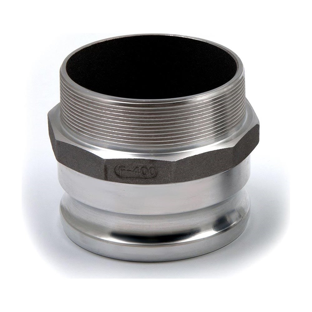 F: тип камлока - соединительный штуцер с наружней резьбой и ответной частью "папа" 400: условное обозначение диаметра камлока 4": внутренний диаметр трубы (условный проход трубы), обозначение размера резьбы в дюймах. Соответствует 100 мм. Вид резьбы: дюймовая трубная коническая R (BSPT) Материал корпуса: горячештампованный лёгкий алюминиевый сплав Номинальное рабочее давление: 7 бар Рабочая температура камлока: от -65°C до +93°C
