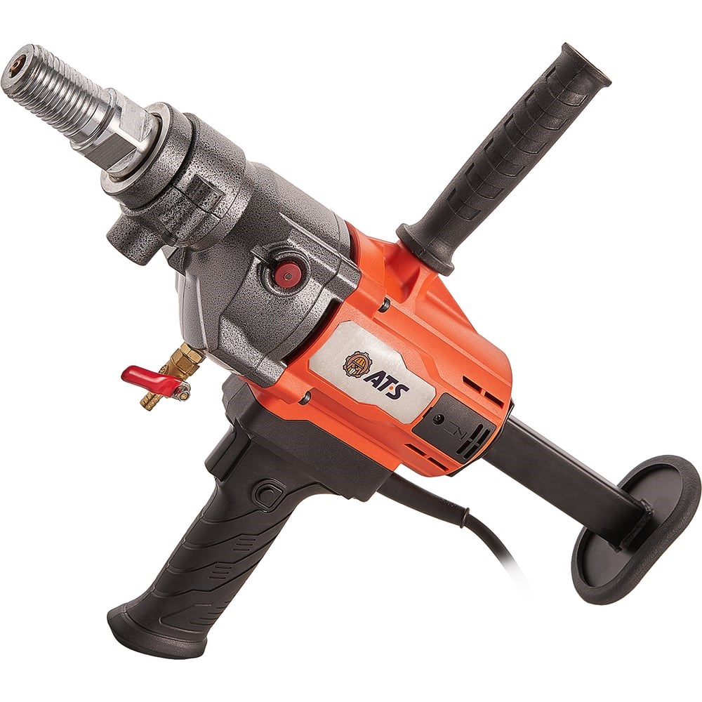 Алмазная дрель AT-S SM-150 оснащена внутренней системой подачи воды. Предназначена для сверления отверстий в бетоне, железобетоне, искусственном и натуральном камне и каменной кладке с использованием алмазных сверлильных коронок с подачей воды. Сухое сверление алмазными дрелями возможно в случаях, когда опасно применять воду. При этом нужно учитывать, что попадание пыли внутрь электромотора значительно увеличивает его износ, так же и алмазные коронки будут быстро изнашиваться. Эффективность технологии алмазного бурения достигается за счет применения чистой водопроводной воды.Дрель можно использовать в любых положениях на 360°, главное защитить электромотор от попадания внутрь воды. Фиксирование вспомогательной ручки на дрели возможно в 8 положениях благодаря съемному кольцу.Основная ручка и вспомогательная ручка прорезинены, удобны и эргономичны. Для удобства сверления в полу вспомогательная ручка переставляется в Т-образное положение.Высокая мощность электропривода и высокий крутящий момент гарантируют эффективность сверления.Кнопка пуска с регулировкой оборотов обеспечивает работу в режиме плавного пуска с пониженным пусковым током (важно при использовании автономных генераторов).В дрели предусмотрена механическая муфта для защиты от поломки при заклинивании коронки. Регулируется снаружи с помощью кнопки блокировки привода на редукторе при затяжке шпинделя гаечным или разводным ключом.Количество срабатываний защитной муфты может достигать более 4000 раз.