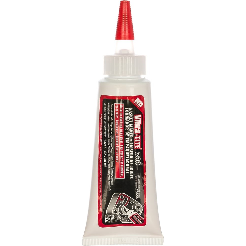 Анаэробный герметик для фланцев Vibra-tite 730 50 мл 73050 средней прочности используется после механической обработки на алюминиевых и жестких фланцах. При попадании в зазор раствор затвердевает создавая сопротивление низким давлениям.