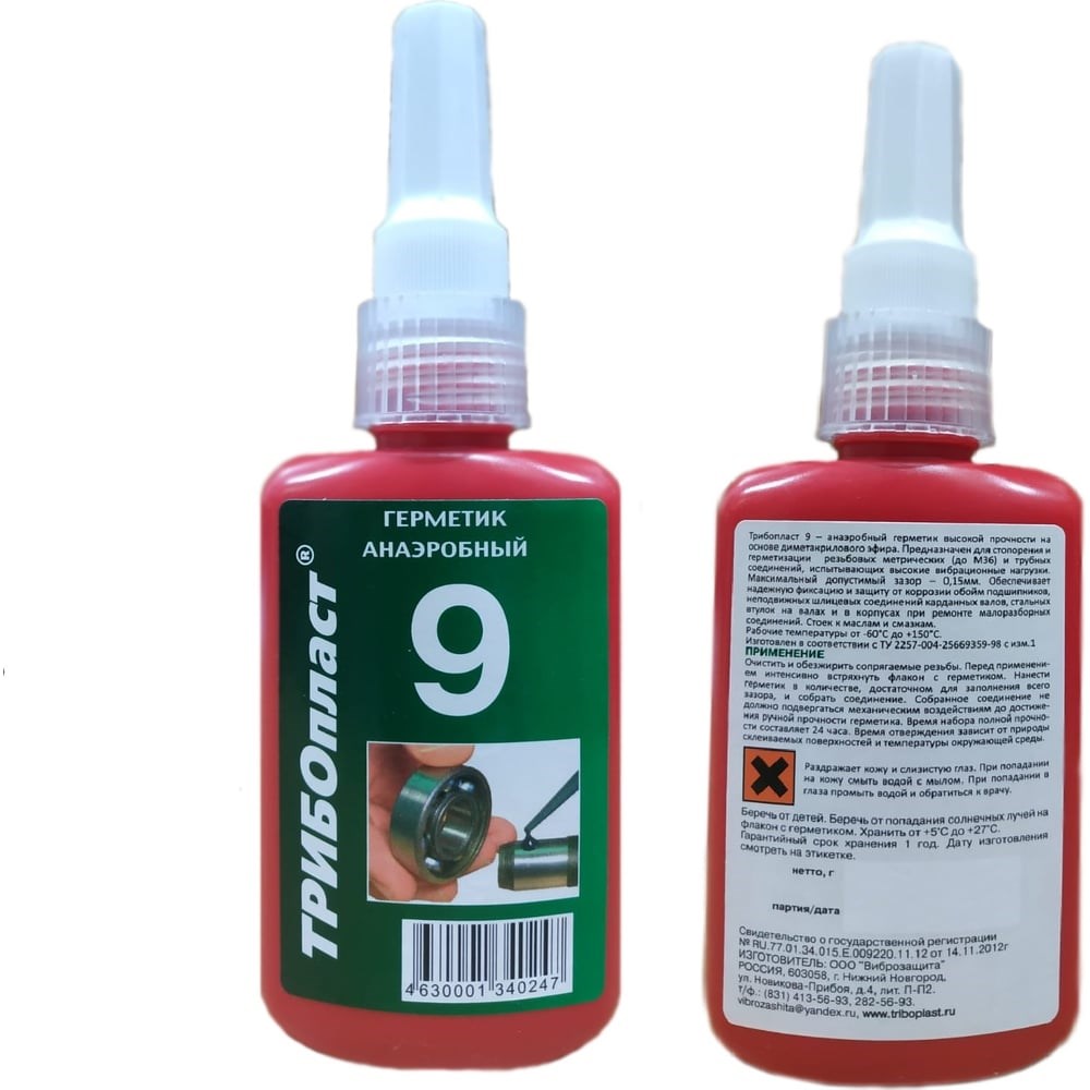 Анаэробный герметик Фиксатор Трибопласт-9 50 г 5258091308016 - однокомпонентный герметик высокой прочности. Продукт полимеризуется при отсутствии воздуха в небольших зазорах (до 0.15мм) между металлическими поверхностями. Область применения: предотвращение самоотвинчивания и герметизация резьбовых соединений (до М36), испытывающих высокие ударные нагрузки и вибрацию; фиксация, защита от фреттинг-коррозии и щелевой коррозии обойм подшипников, неподвижных шлицевых соединений карданных валов, стальных втулок на валах и в корпусах при ремонте малоразборных соединений. Демонтаж требует больших усилий или локального нагрева до +250°С. Прочностные характеристики отвержденного продукта (испытания через 24 часа при +22°C): Момент отвинчивания на резьбовой паре М10 из конструкционной стали без покрытия, 30-50 Н•м. Предел прочности при аксиальном сдвиге на цилиндрических образцах из стали 40, 20-27 МПа.
