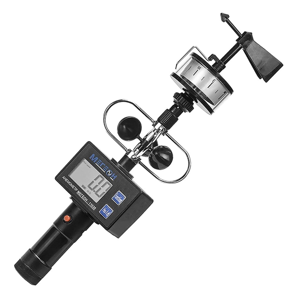 Анемометр предназначен для измерения скорости и силы воздушного потока. Он оснащен съемным флюгером, который прикручивается к чашечному измерителю силы ветра. Флюгер имеет встроенный компас для определения сторон света. Низкое сопротивление вращения обеспечивает минимальную погрешность при измерении и высокую точность. Скорость срабатывания прибора - 1 секунда.