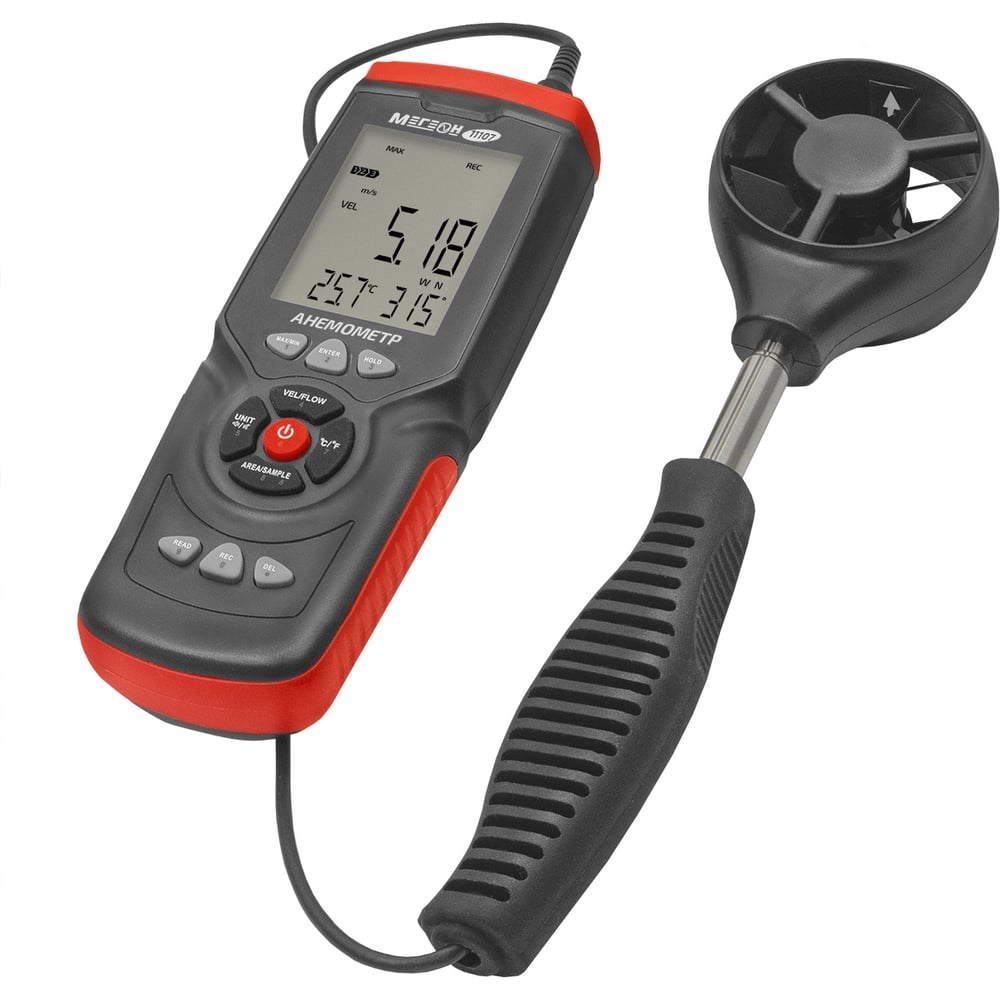 МЕГЕОН 11107 - это цифровой анемометр 3 в 1 с выносным датчиком на телескопическом удлинителе. Прибор предназначен для измерения скорости, влажности и температуры воздуха, тем самым сможет собой заменить три измерителя. Поможет рассчитать объёмный расход воздуха. Кроме этого с легкостью позволит вычислить минимальную, максимальную и среднюю скорость воздушного потока, также предусмотрена функция записи данных в память устройства на 960 показаний, а благодаря подключению к ПК, можно посмотреть результаты и провести анализ в специализированной программе. Прибор получил современный дизайн и большой ЖК- дисплей с подсветкой, а эргономичные формы корпуса и рукоятки зонда положительно сказываются на удобстве эксплуатации. В дополнение на задней стенке расположено монтажное отверстие для установки изделия на штатив.