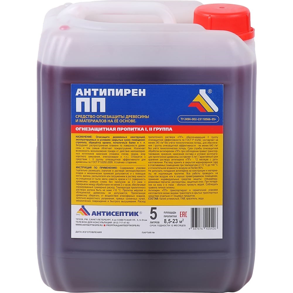 Антипирен I группа ЗАО "Антисептик" ПП в канистре 5 литров 00-00003664 обеспечивает защиту деревянных конструкций, эксплуатируемых в условиях закрытых сухих помещений с относительной влажностью воздуха не более 80% (стропила, обрешетка кровли и т.п.). Поверхностная огнезащитная пропитка затрудняет распространение пламени по поверхности древесины и тем самым облегчает пожаротушение. В ряде случаев она исключает возможность возникновения пожара от действия малокалорийных источников зажигания (пламени спички, окурка, искр короткого замыкания и электросварки и др.). Антипирен «ПП» относится к средствам I, II группы огнезащитной эффективности для древесины по ГОСТ Р 53292-2009. Устойчив к старению. Гарантийный срок службы огнезащитной обработки антипиреном «ПП» - от одного года и более в зависимости от поглощения (удержания) препарата древесиной и условий ее эксплуатации.