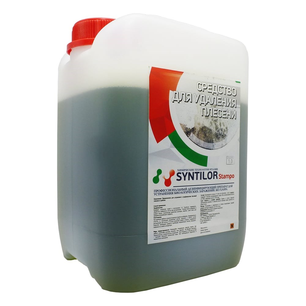 Средство для удаления плесени Syntilor Stampo 5 кг 1065 подходит для внешней и внутренней обработки различных поверхностей. Эффективно очищает от плесени и препятствует ее возникновению. Не содержит хлора и вредных веществ в составе. Средство выпускается в виде концентрата и обладает следующими преимуществами: без запаха; экономное расходование; оказывает дезинфицирующее действие; повышает фунгицидные свойства ремонтных покрытий; применяется для внешней и внутренней обработки; наносится без следов, потеков и разводов.