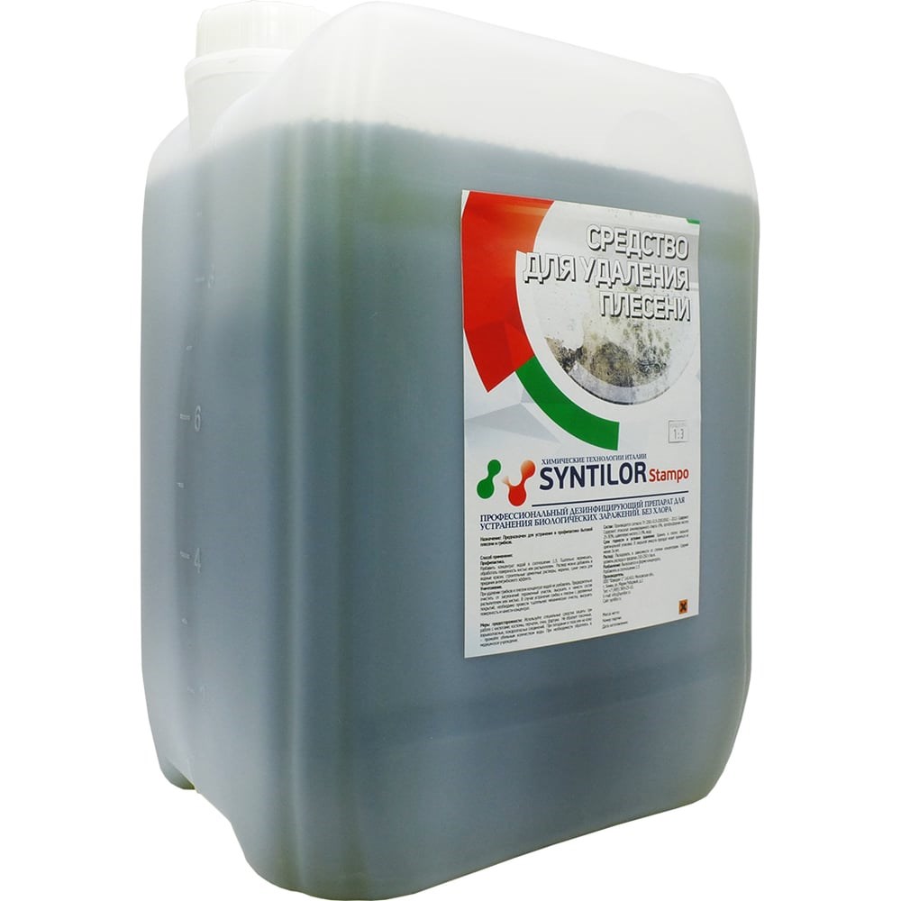 Средство для удаления плесени Syntilor Stampo 11 кг 1066 помогает избавиться от грибковых и бактериальных отложений в ванне, бассейне, на кухне. Используется как для очищения, так и для профилактики возникновения плесени. Не содержит хлор и токсичные вещества. Имеет следующие преимущества: без запаха; экономное расходование; оказывает дезинфицирующее действие; повышает фунгицидные свойства ремонтных покрытий; применяется для внешней и внутренней обработки; наносится без следов, потеков и разводов.
