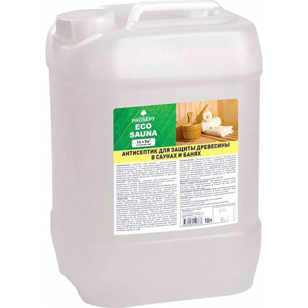 Антисептик для бань и саун PROSEPT ECO SAUNA 10л. 016-10 готовый к применению раствор для защиты древесины при циклическом увлажнении и перепадах температур – антисептик, который используется для обработки любой древесины в саунах, включая конструкционные элементы: стены, потолок, полки и напольные решетки. Предназначен для защиты древесины от действия дереворазрушающих и деревоокрашивающих плесневых грибов в саунах, парных, моечных и прилегающих к ним помещениях.Обеспечивает надежную защиту при циклическом увлажнении и перепадах температур.Антисептик способен как предотвращать биопоражение, так и останавливать уже начавшиеся процессы поражения древесины биологическими агентами. Обработанная древесина, при необходимости легко пропитывается маслами для саун, окрашивается и тонируется. Не изменяет естественный аромат и структуру древесины. При обработке светлых пород древесины возможно легкое тонирование в желтый оттенок.ECO SAUNA – это высокоэффективная композиция синтетических биоцидов нового поколения на водной основе. В составе используются вещества, применяемые для обеззараживания и дезинфекции в медицине и на пищевых производствах. Срок защиты во многом зависит от интенсивности эксплуатации. В помещениях, где отсутствует риск прямого действия влаги, срок защиты может составить 10 лет. В саунах, где используется «сухой пар», рекомендуется проводить профилактическую обработку каждые 3-5 лет. В парных и моечных профилактику следует проводить раз в 2-3 года.